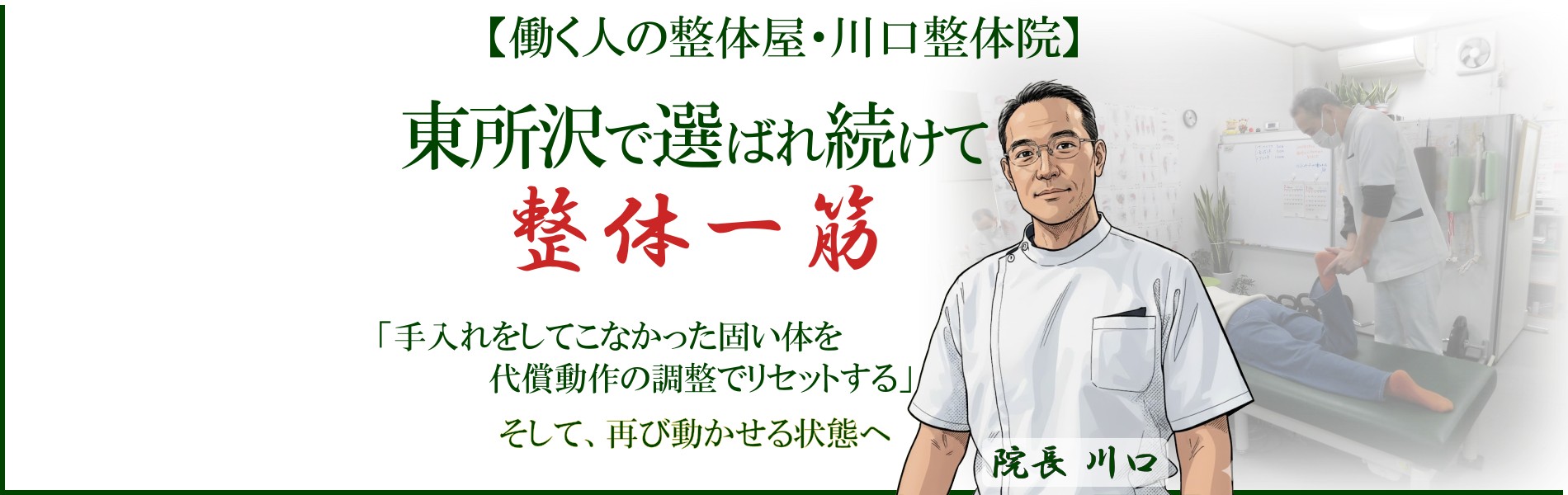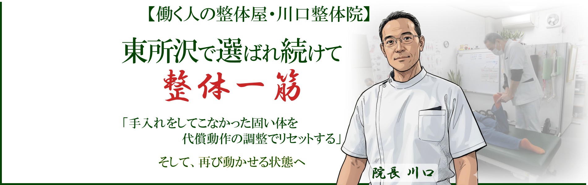 こんにちは、東所沢駅徒歩5分のところにある川口整体院の川口です。所沢市を中心に清瀬市、三芳町の方が来院されています。